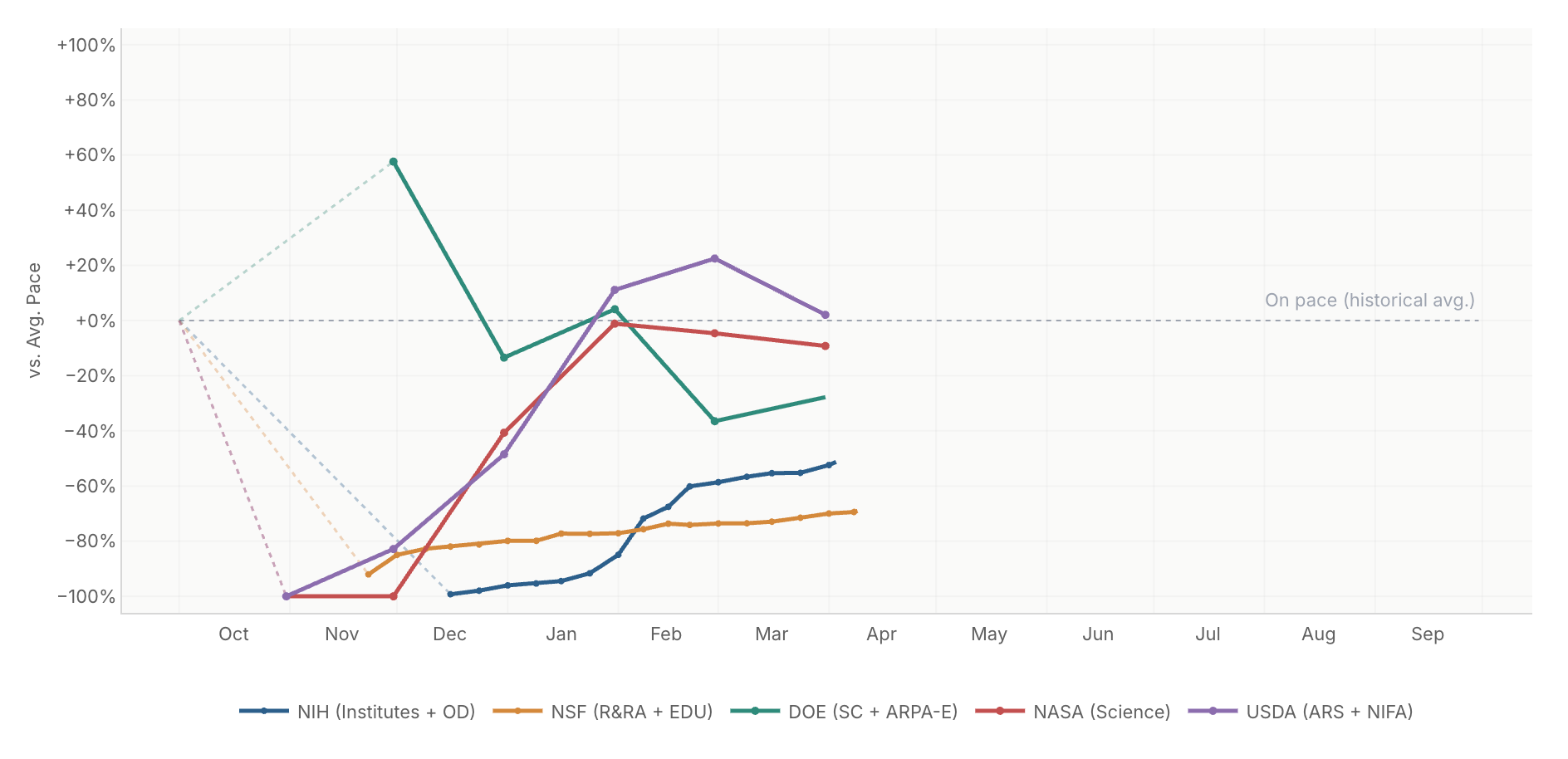At time of writing, the NSF’s situation is the most concerning. NSF is making new awards roughly 70% slower than typical, and even its more general rates of getting money out of the door (both “all awards” and “obligations”) are almost 60% behind pace.5 In FY25 NIH was able to close a similarly large gap, in part by increasing its use of forward funding;6 NSF has less room to use that lever this year, as it already uses up-front funding for the majority of its grants.