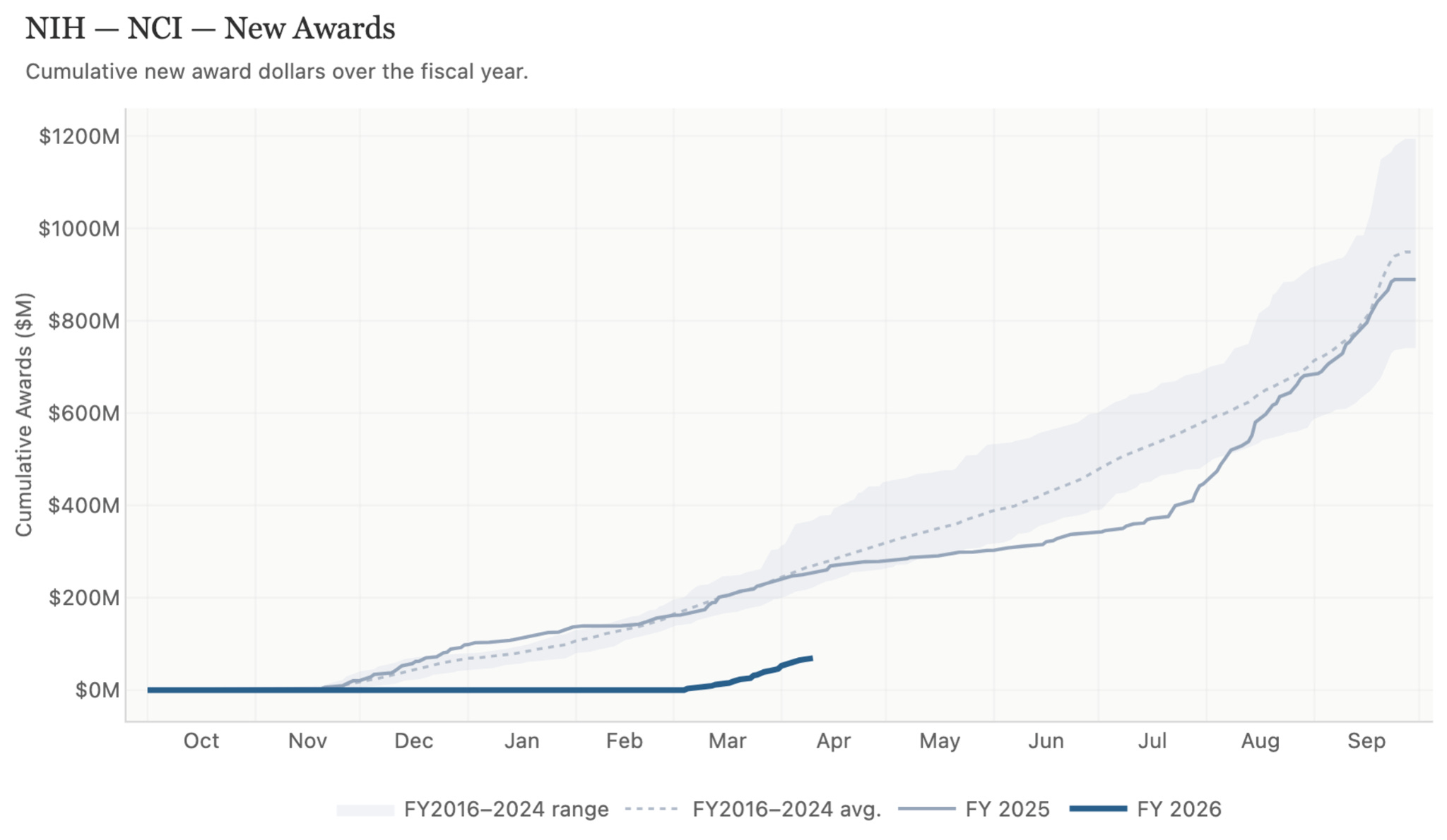 NIH is also significantly behind pace in FY26, spending money on new grants roughly 50% slower than it typically has; it is also 29% behind on all award-making, and 16% behind on all obligations. Notably, these topline numbers hide substantial heterogeneity across institutes. The National Cancer Institute, for example, is even farther behind pace than the agency as a whole, having spent 79% less on new grants, and 43% less on grantmaking overall, than is typical at this point in the fiscal year. The National Institute of General Medical Sciences, meanwhile, is near its normal pace.7
