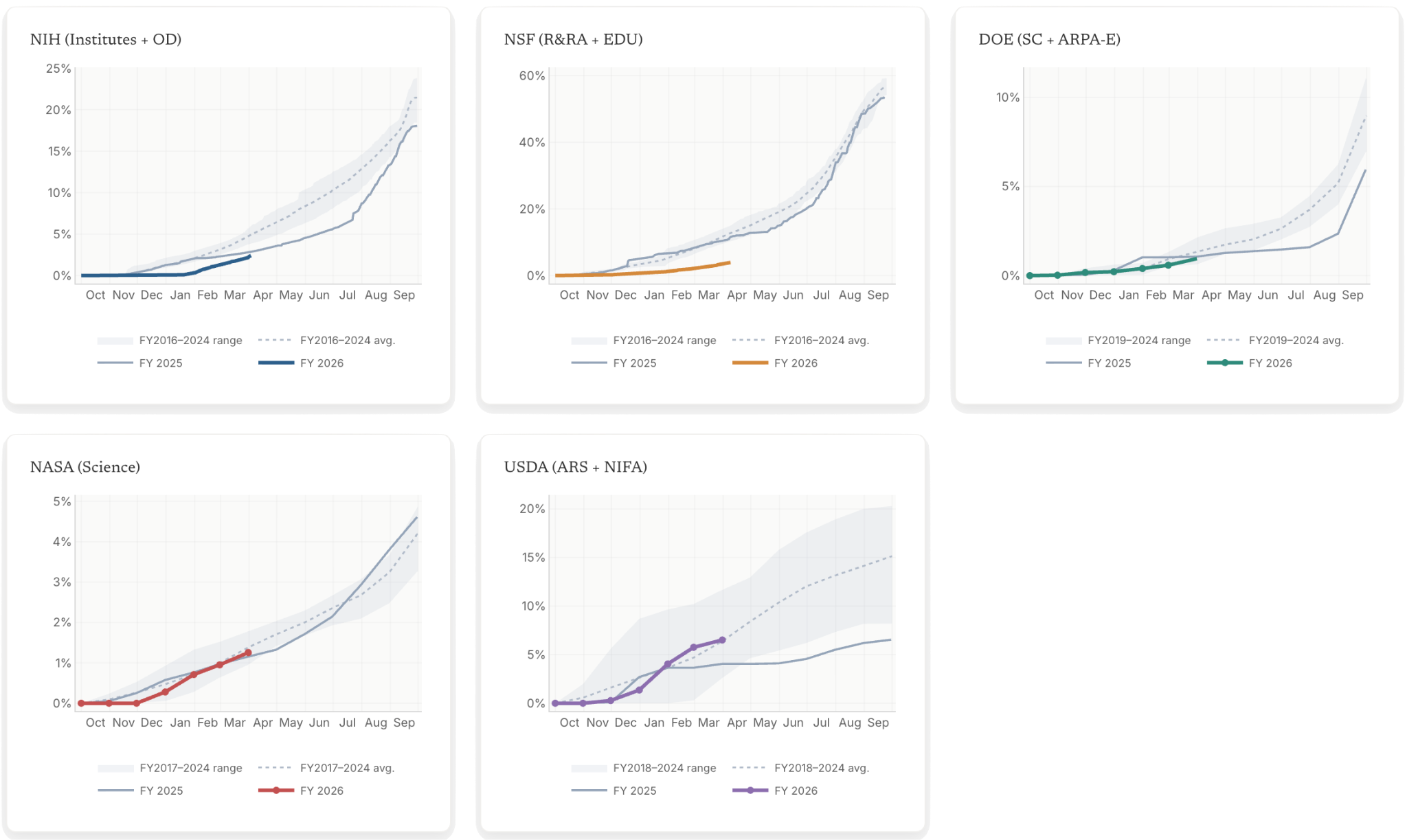 Other agencies are in a better position. DOE’s science spending is a bit behind pace overall, with the Office of Science’s lack of grantmaking8 being balanced out by ARPA-E’s increased spending after having spent well under its appropriation in FY25. NASA is slightly behind its typical pace, and USDA is roughly on track.
