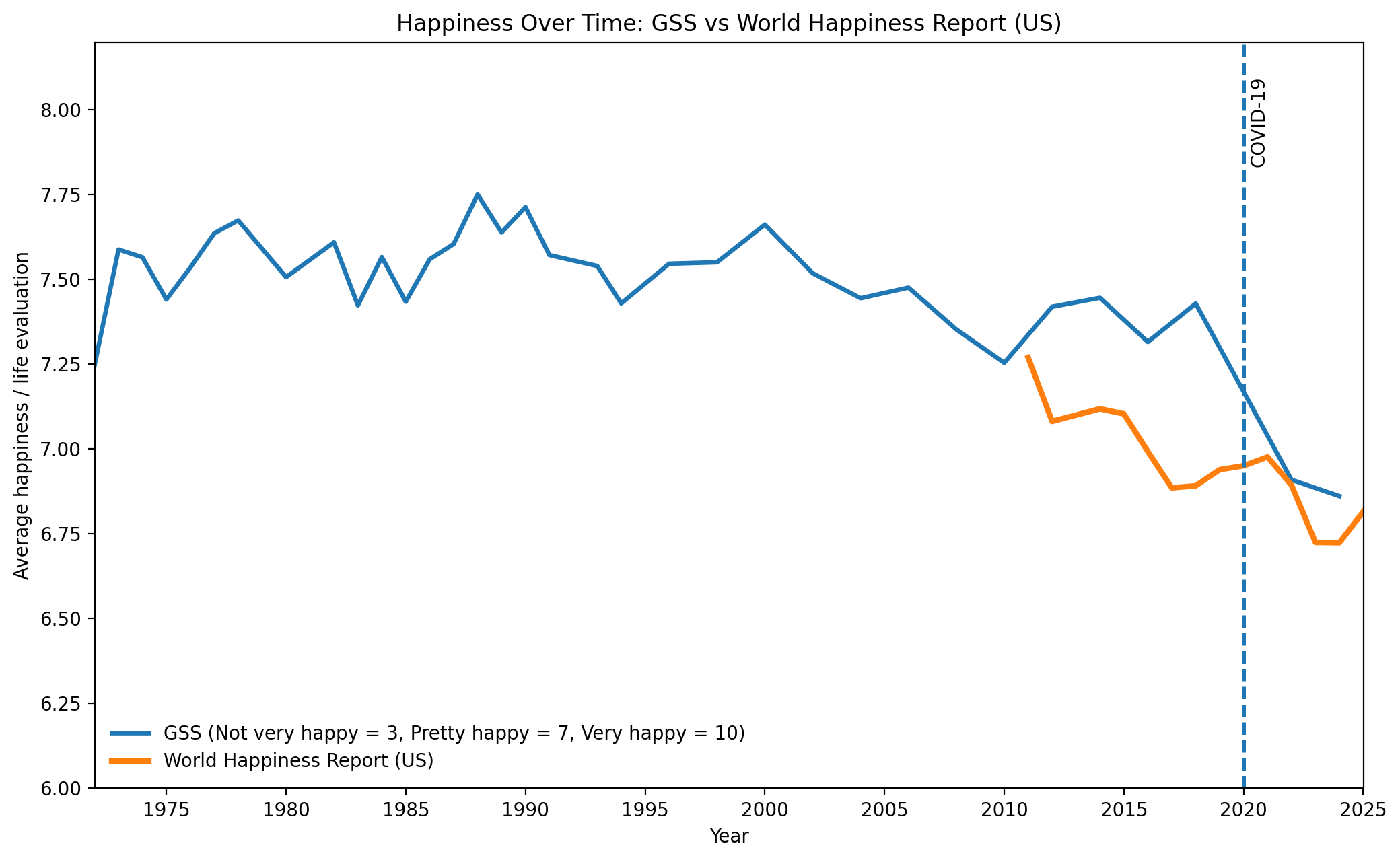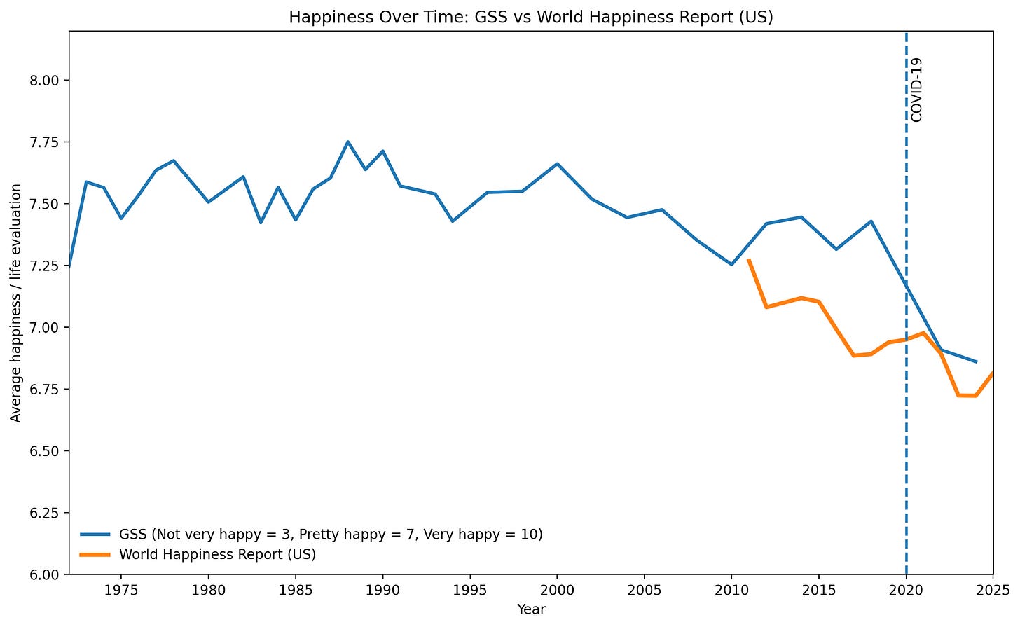 Sam Peltzman has an alarming new paper about American happiness. Since 1972, the General Social Survey (GSS) has asked a random sample of Americans how happy they were, and in the blue line of the figure above I’ve plotted average happiness by assigning numerical values to the possible answers. Peltzman documents a big negative trend break starting around Covid-19, which has persisted into at least 2024, well after the abatement of the worst of the pandemic. I was curious if this was some fluke in the GSS, so in the figure above, I added US data on self-reported life satisfaction from Gallup’s World Happiness Report. Gallup only has data from 2011 to 2025, and the two series do not exhibit the same year-by-year fluctuations. Nonetheless, both show American well-being remains near unusually low values, at least circa 2024 and 2025. — Matt Clancy