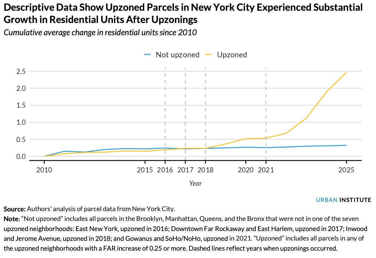 A new Urban Institute piece asks, what happens to housing production after “big upzonings” in strong housing markets? It turns out, a lot. Top economics journals have long considered case studies of upzoning too trivial to publish–it is obvious that lifting a quota on housing production in locations where homes sell for more than the marginal supply cost of homes will result in new housing production. But earlier peer-reviewed research in planning journals had focused on small upzonings that produce small changes–a corollary to our last blog post about the need for feasibility-oriented large upzonings. This new paper begins to fill the case study gap on large upzonings with by-right permitting in strong markets. — Alex Armlovich