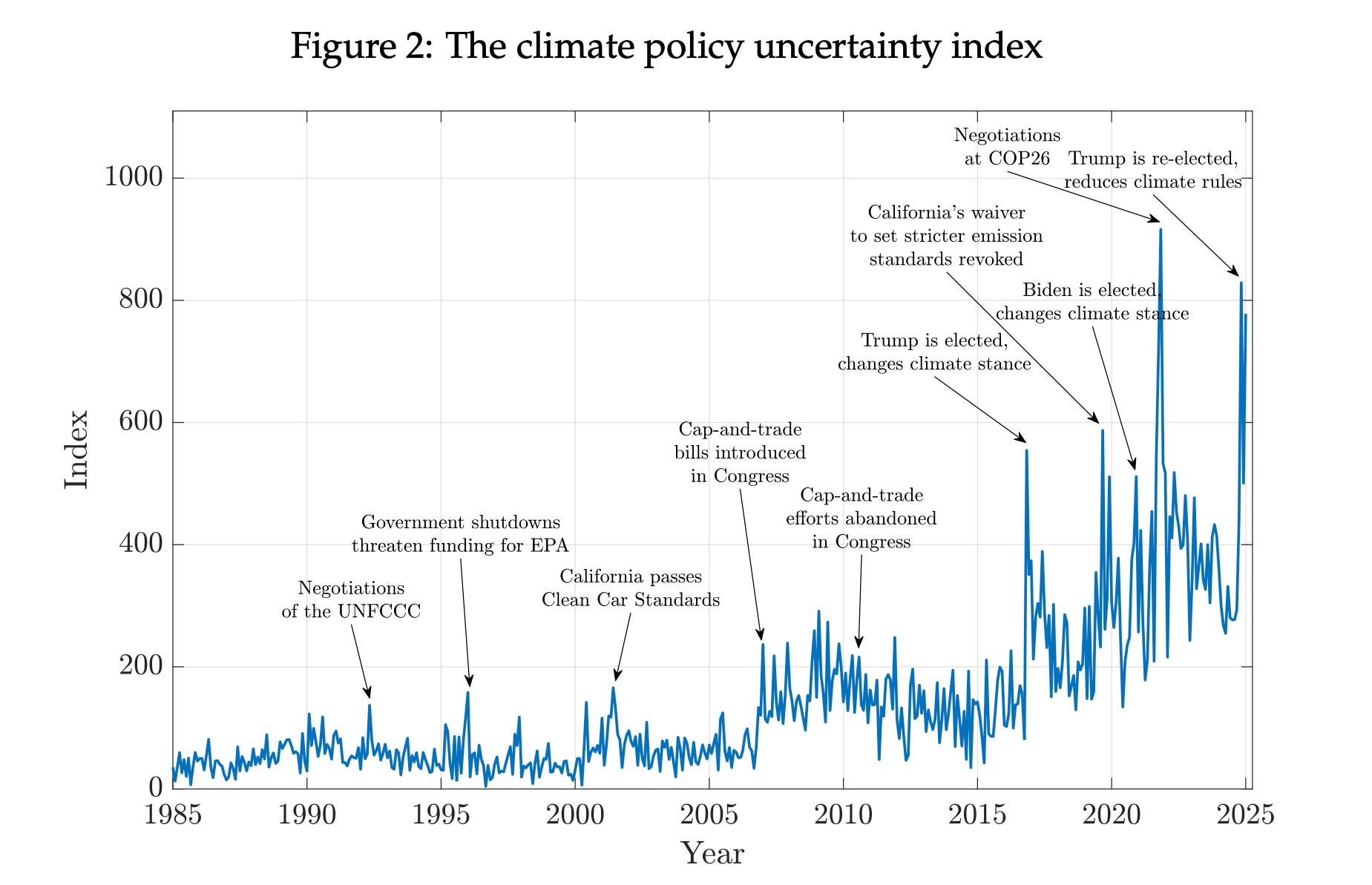 The EPA just repealed the endangerment finding – the 2009 determination that greenhouse gases endanger public health and welfare, and the regulatory foundation for US climate policy under the Clean Air Act. Philip Rossetti at R Street has a helpful take on the legal battles likely to follow, and why sound regulatory design beats legal whipsawing. Timely: a working paper out last month (bite-sized summary here) finds that this type of climate policy uncertainty reverberates through the economy, depressing firms’ investment and R&D, reducing output, and raising prices. — Willow Latham-Proenca